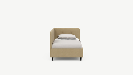Угловая односпальная кровать MOON FAMILY 1253 с мягкой спинкой и изголовьем обладает округлыми формами, привносящими в интерьер нотки нежности. Изголовье, украшенное пуговицами, добавляет окружающему пространству шарм и уют. Высокие опоры придают кровати визуальной легкости, а также обеспечивают удобство во время уборки.