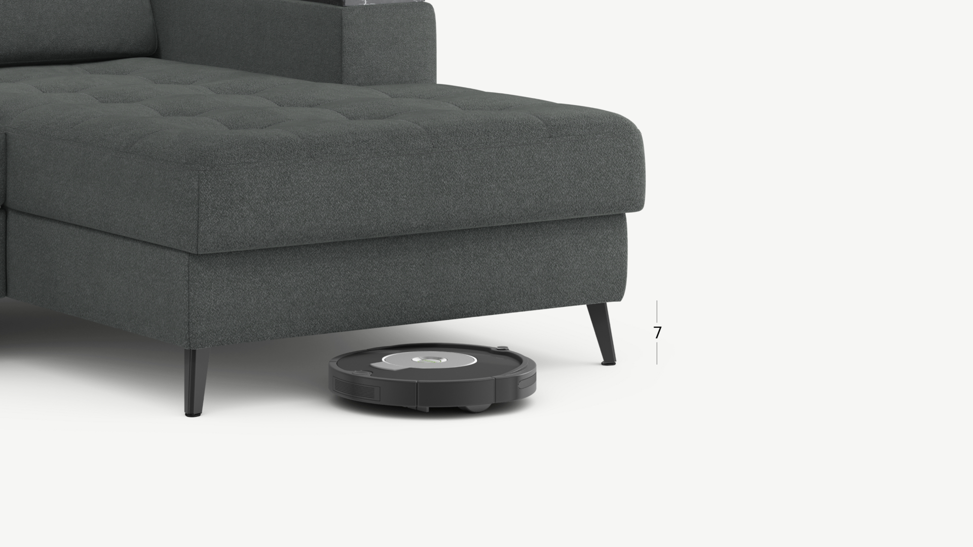 Благодаря высоким наклонным опорам под диваном проходит робот-пылесос и легко проводится влажная уборка, что обеспечивает чистоту и порядок в доме.